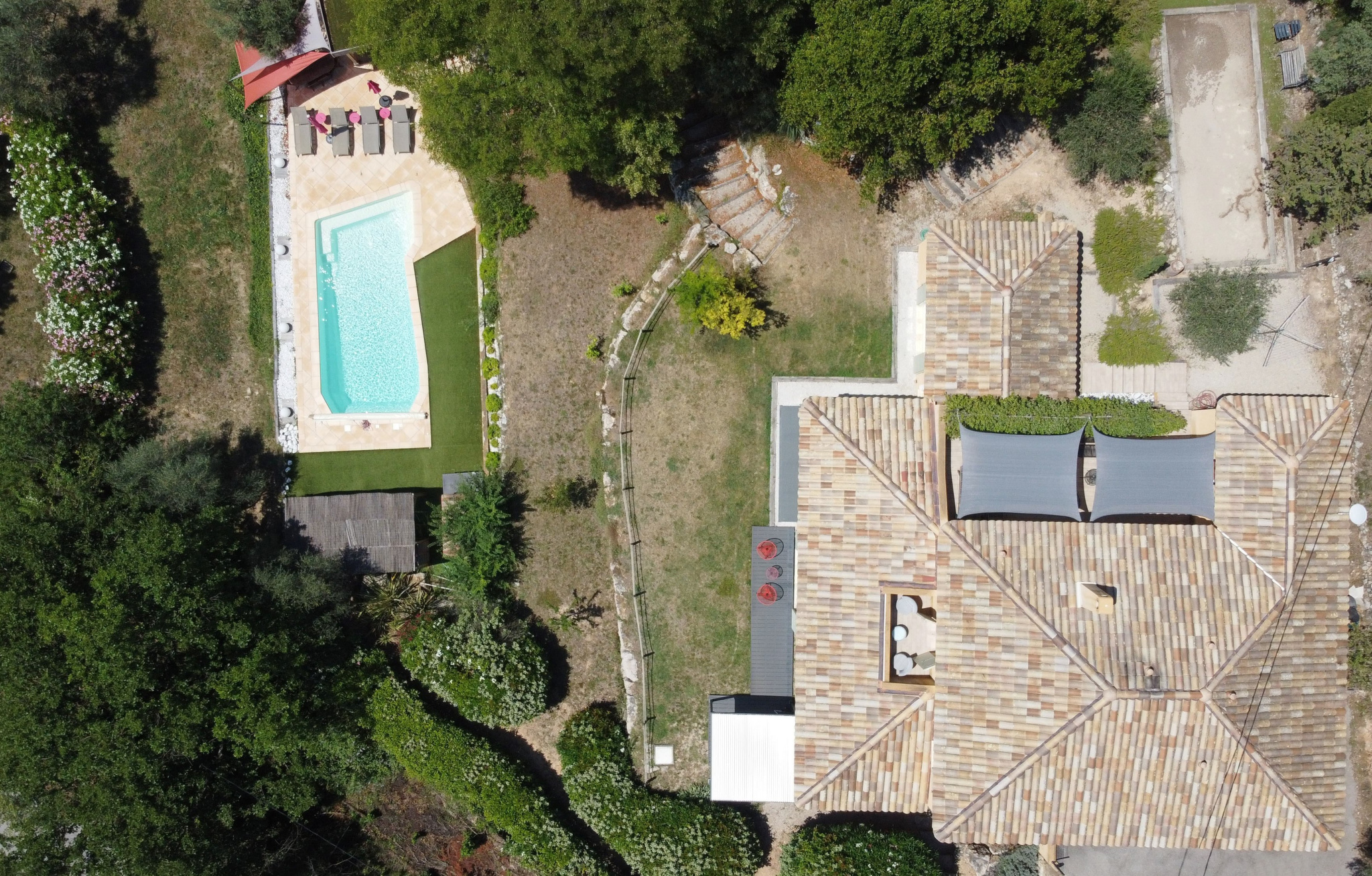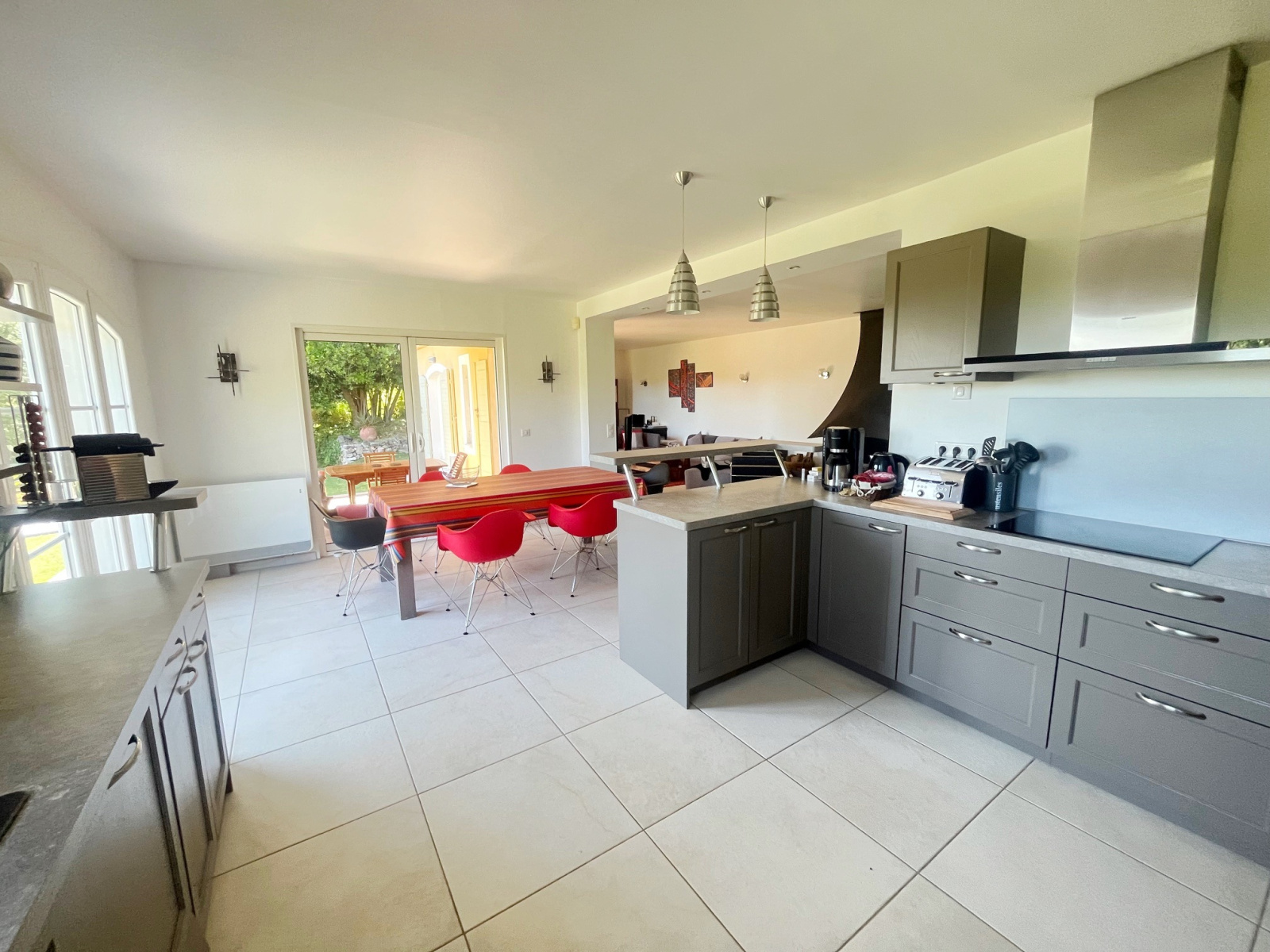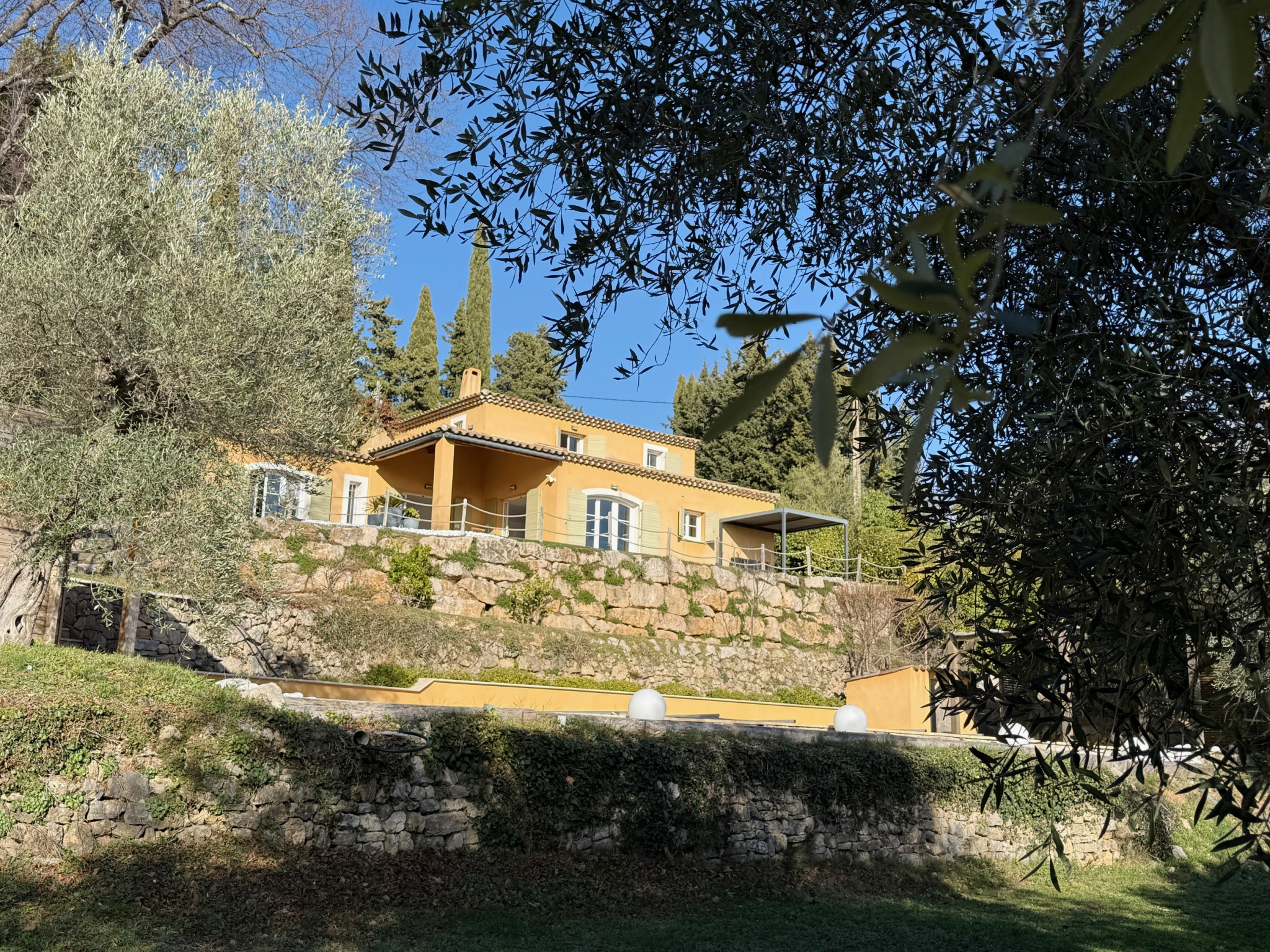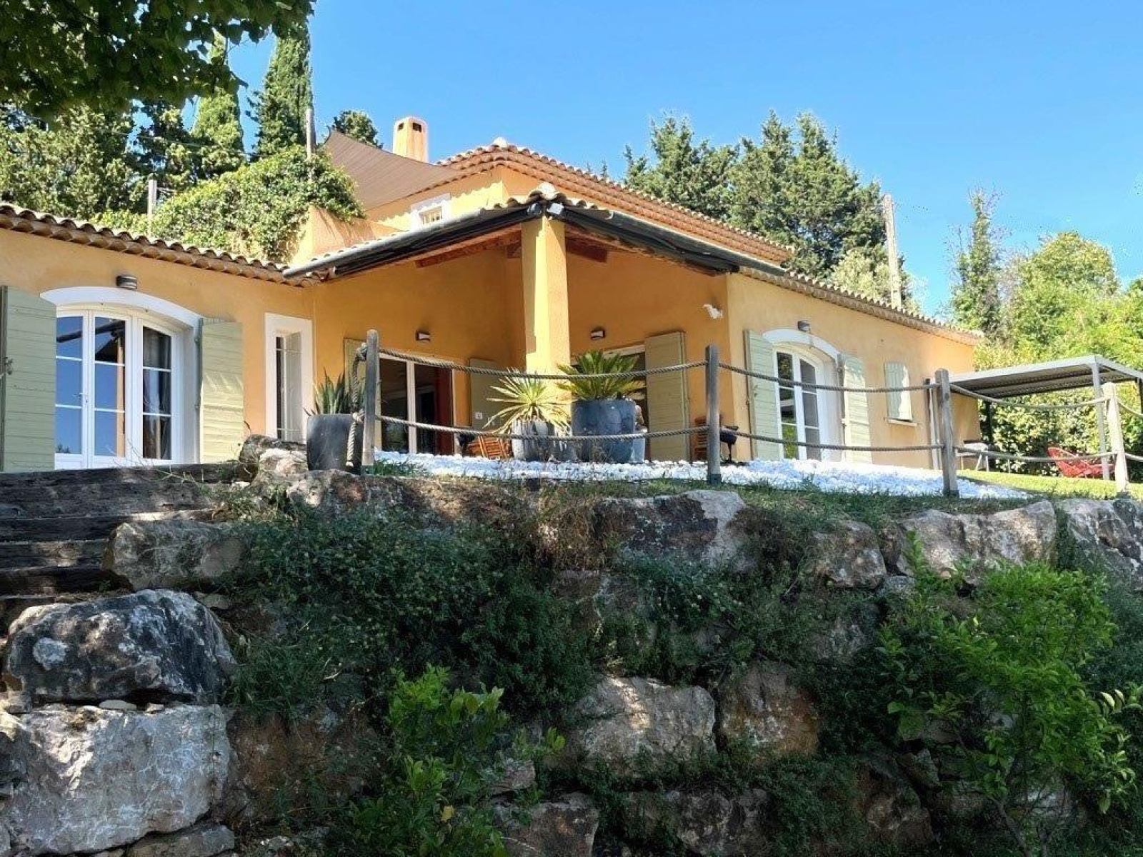 Proche du village de Montauroux, villa dominante 200 m² env. à vendre bénéficiant d'une très belle vue comprenant : entrée, séjour lumineux avec suberbe cheminée, cuisine américaine équipée ouvrant sur terrasse couverte, cellier, 1 chambre en suite avec sa salle d'eau privative. A l'étage : 3 autres chambres avec terrasse dont une suite parentale avec salle d'eau et dressing, salle de bains. Terrain 3600m² paysagé, piscine chauffée, garage double, annexes, cave.